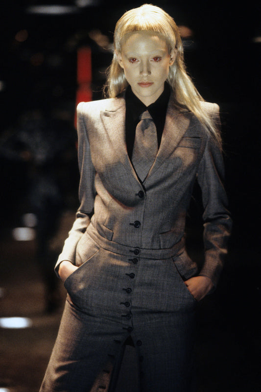 alexander mcqueen jacket with strong shoulders & vertical pockets, f/w 1998 “joan”