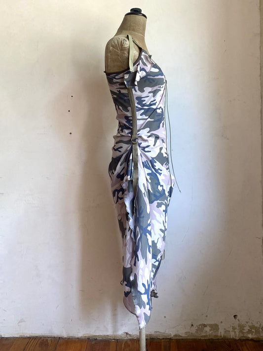 mesh camouflage dress with adjustable straps and drawstrings, late 90s