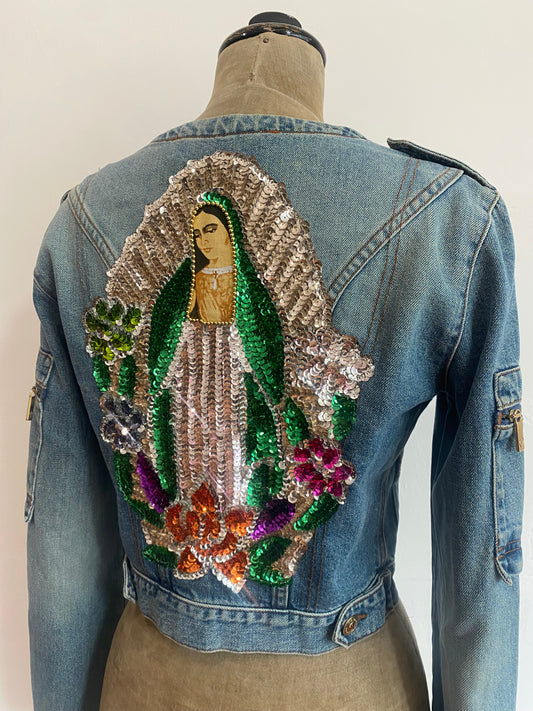 voyage passion denim cargo jacket with maria embroidery, 2000s