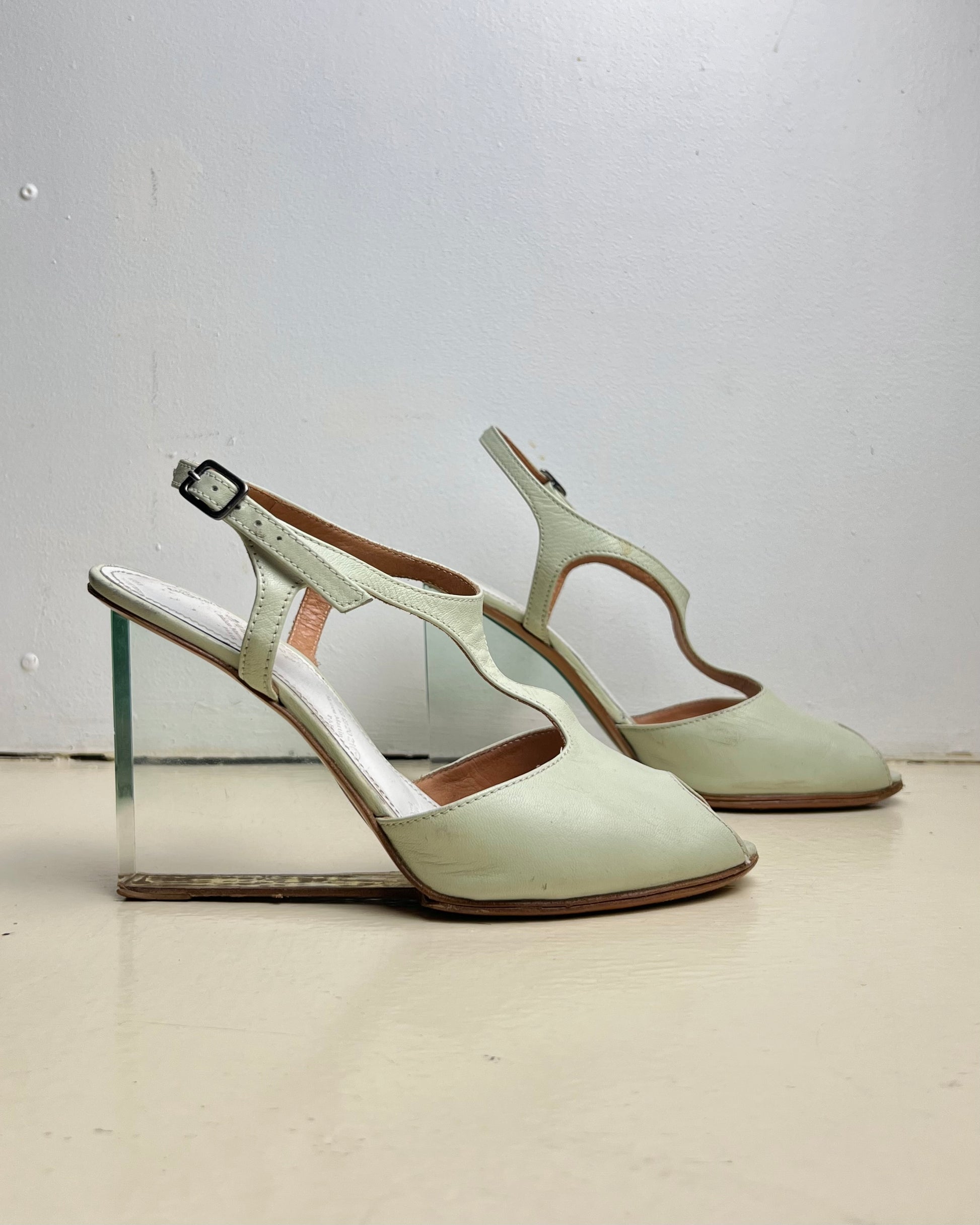 muted leather mint wedges from margiela's spring 2007 colection. as seen on the runway and in various iterations, the wedge is made up of clear plexiglass, giving the appearance of a "floating" foot when worn..! this pair features an open toe, and ankle strap for support. leather upper, inner, and outsole. made in italy.