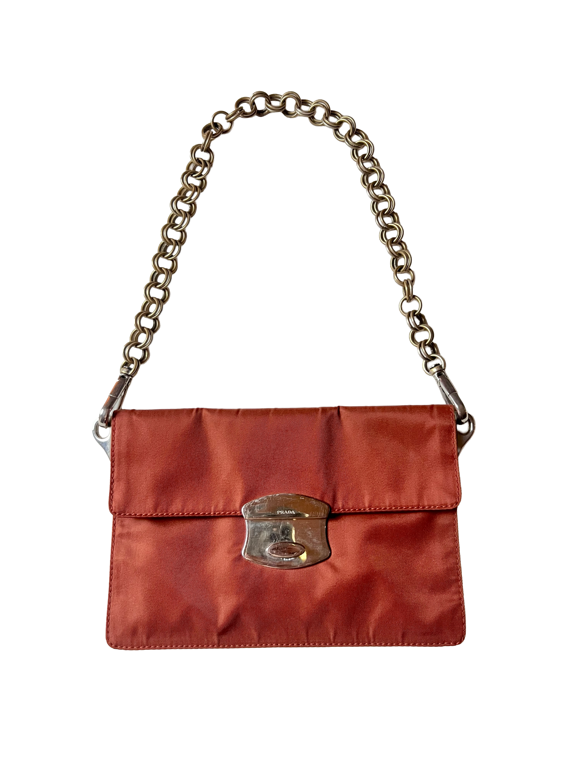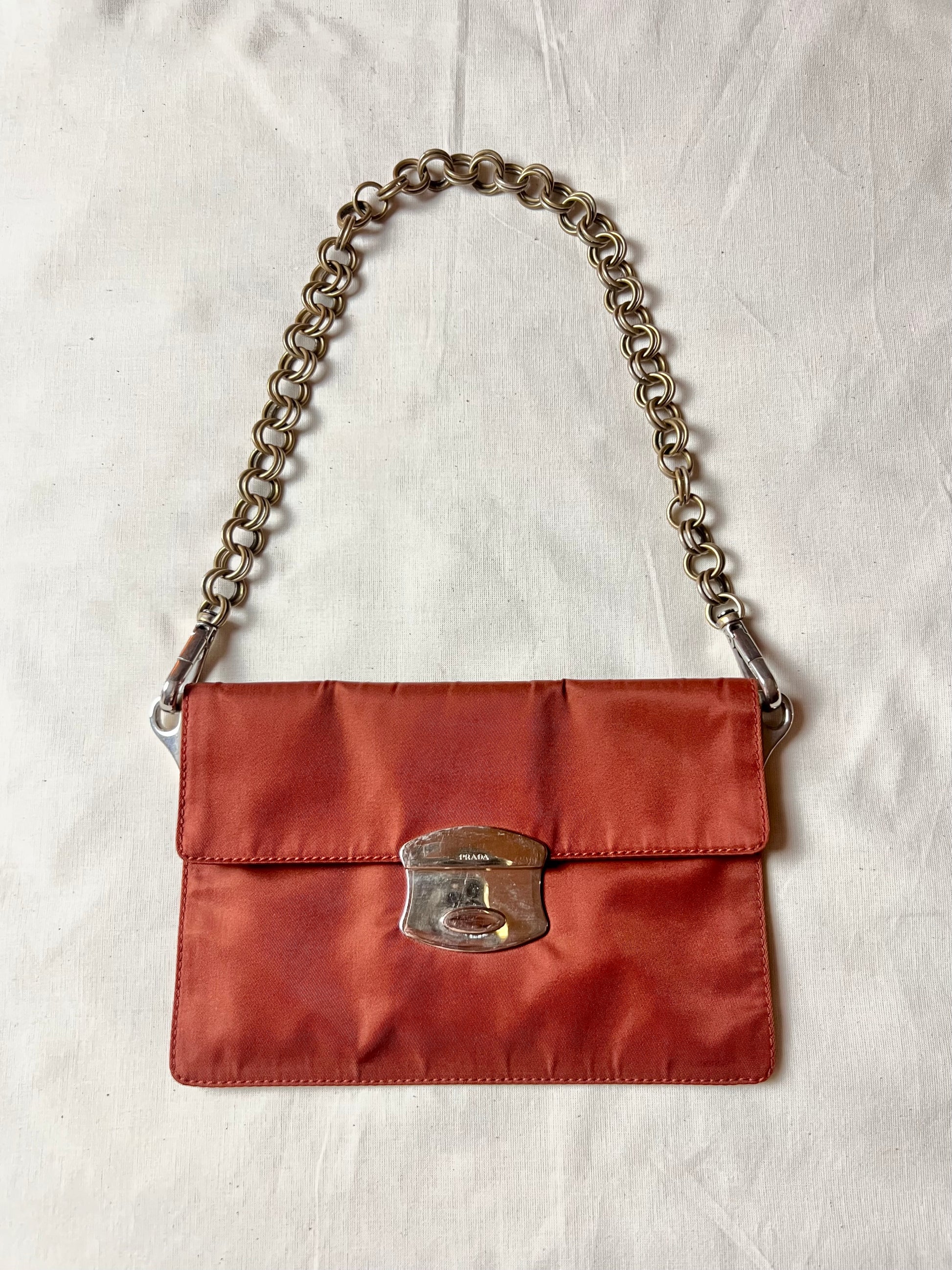 nylon envelope clutch in a beautiful salmon-coral colorway. as seen on the runway and in the season’s campaign in leather- very heavy & removable metal chain strap allows possibility of wear at shoulder or in-hand. comes with original authenticity cards | 20 W x 13 H x D 1 (cm).