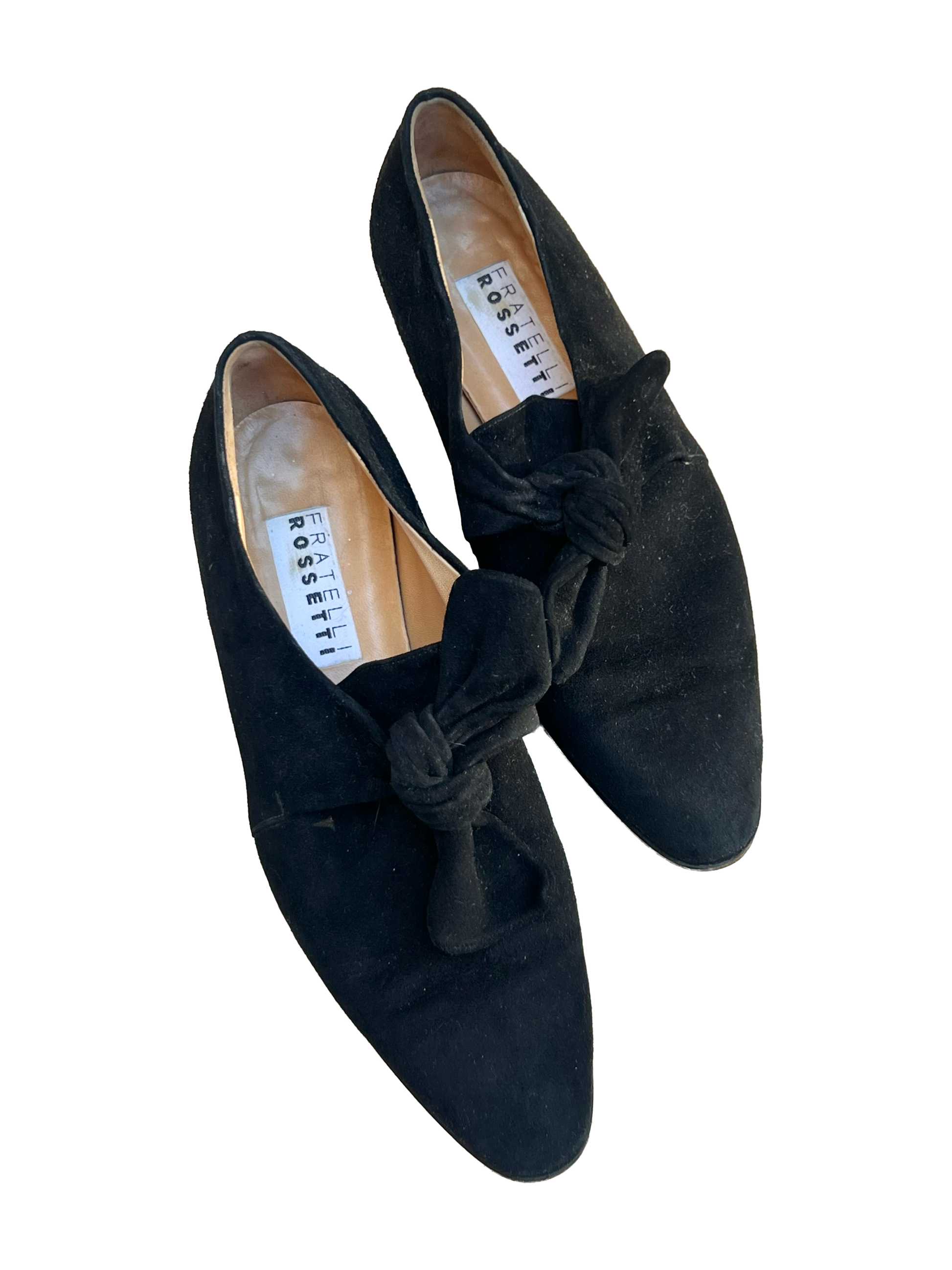 gigli-inspired supple suede knotted loafers by fratelli rossetti. the tendril-like ties allow the wearer to adjust as desired. see accompanying imagery for very similar styles shown by gigli throughout the 80s and 90s.