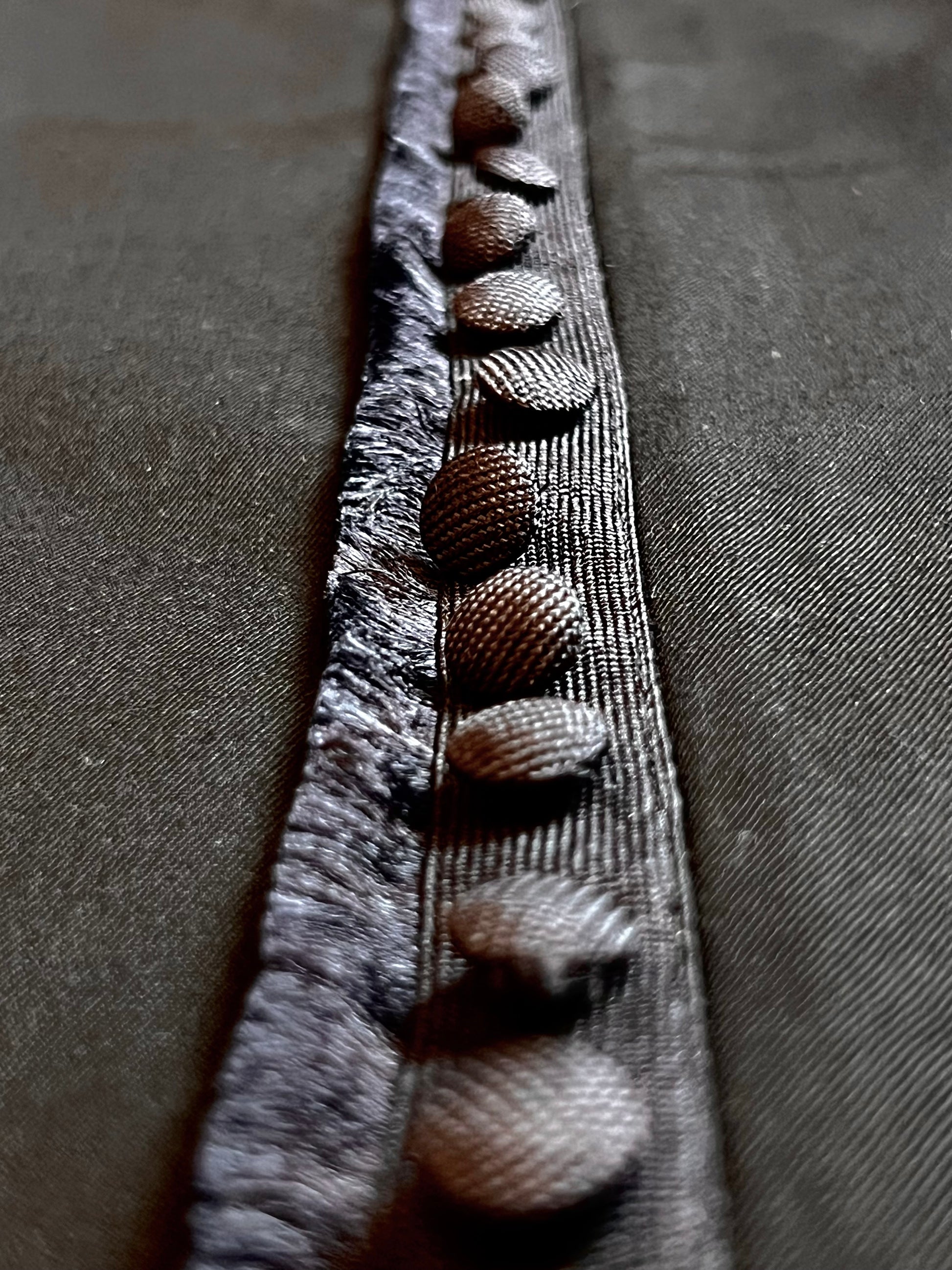 yves saint laurent by tom ford toreador or matador inspired tuxedo-style trousers. features two rows of fabric covered buttons and a small panel of fringe along each leg. unparalleled quality and beautifully tailored, with an ultra high rise and long, slim leg. two pockets at front, still sewn shut. made in france.