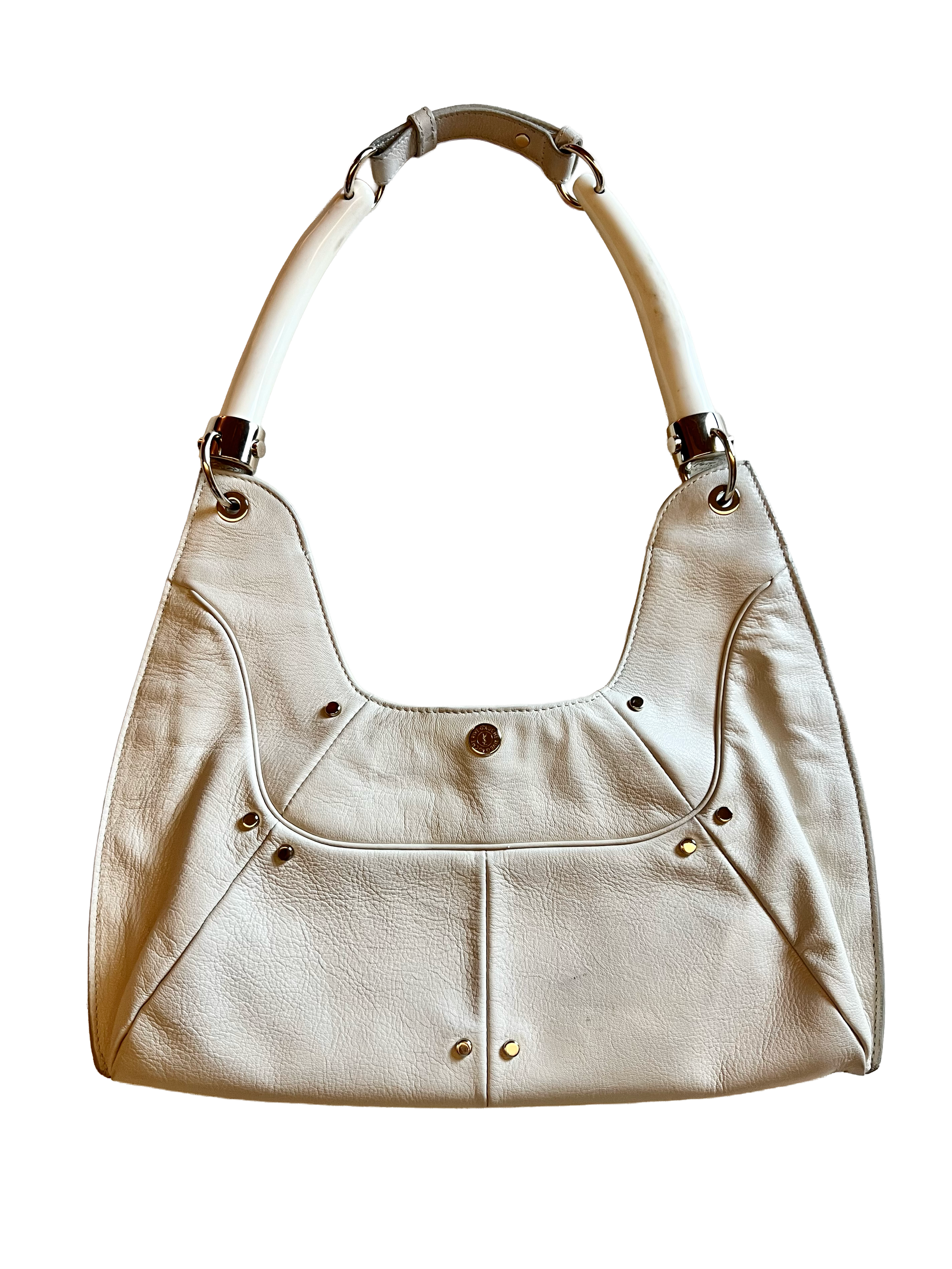 ecru leather mombasa shoulder bag. medium sized, with two genuine animal tusks and small leather belted handle for easy and comfortable wear at shoulder. features one concealed zip pocket, with a black satin lining, and muted gold hardware. many different iterations of the double horned style mombasa’s were presented for the spring ‘04 collection. made in italy.
